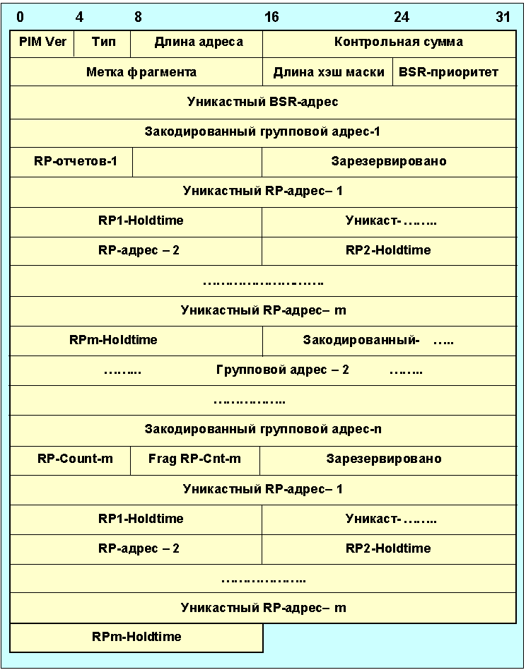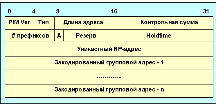 Рис. 4.4.9.5.11. Формат сообщения assert Поле закодированный групповой адрес характеризует групповой адрес места назначения пакетов, который явился причиной посылки сообщения assert. Поле уникастный адрес отправителя содержит IP-адрес отправителя из дейтограммы, вызвавшей посылку мультикастного пакета Assert. Длина поля в байтах определена полем длины адреса. Поле R представляет собой RPT-бит. Если IP мультикастинг дейтограмма, вызвавшая посылку пакета assert направляется вниз по RP-дереву, тогда RPT-бит равен 1. Если маршрутизация осуществляется вдоль SPT, бит равен 0. Поле предпочтение несет в себе значения кода предпочтения, присвоенного уникастному протоколу маршрутизации, который организует проход до ЭВМ. Поле метрика содержит значение метрики для таблицы маршрутизации. Единицы измерения должны соответствовать требованиям маршрутного протокола. Сообщения кандидата RP посылаются периодически C-RP способом и уникастно адресуются к BSR. Формат таких сообщений показан на рис. 4.4.9.5.12.