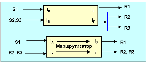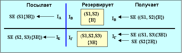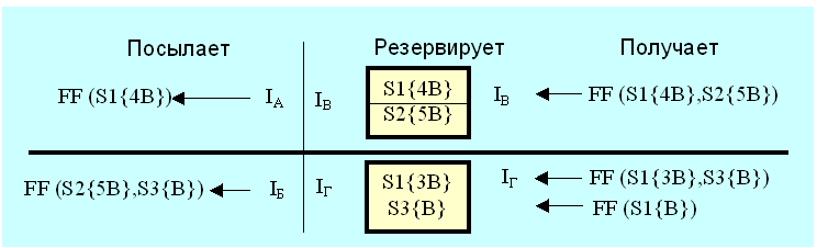 Рис. 4.4.9.6.5. Пример резервирования SE (Shared-Explicit) Приведенные примеры предполагают, что информационные пакеты от S1, S2 и S3 маршрутизируются через оба выходных интерфейса. Нижняя часть рис. 4.4.9.6.2 показывает еще одно предположение о маршрутизации: информационные пакеты от S2 и S3 не переадресуются интерфейсу IВ, напр., из-за того что сеть обеспечивает более короткий путь для пакетов отправителя к R1. Рис. 4.4.9.6.3 показывает пример резервирования WF именно при этом предположении (стрелками отмечены допустимые маршруты). Так как нет пути от IБ к IВ, резервирование, переадресуемое интерфейсом IБ, рассматривает резервирование только для интерфейса IГ.