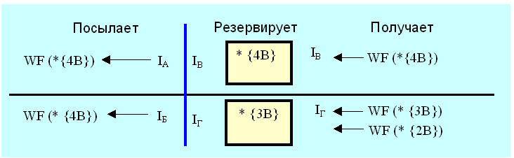 Рис. 4.4.9.6.2. Конфигурация маршрутизатора Для простоты эти примеры показывают flowspec как одномерное кратное повторение некоторого базового качества ресурса B. Колонка "Резервирует" показывает запросы резервирования RSVP, полученные через выходные интерфейсы IВ и IГ, а колонка "Получает" показывает результирующее состояние резервирования для каждого интерфейса. Колонка "Посылает" показывает запросы резервирования, посланные предшествующим узлам (IА и IБ). В колонке "Резервирует" каждая рамка представляет один зарезервированный виртуальный канал с соответствующим дескриптором потока. Рис. 4.4.9.6.3, демонстрируя стиль WF, показывает две ситуации, в которых требуется объединение.