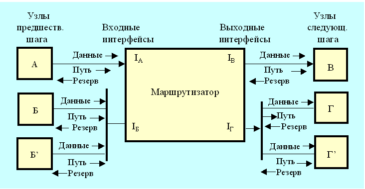 Рис. 4.4.9.6.6. Маршрутизатор, использующий RSVP На рис. 4.4.9.6.6 проиллюстрирована модель RSVP узла маршрутизатора. Каждый поток данных приходит со стороны предшествующего узла через соответствующий входной интерфейс и выходит из маршрутизатора через один или несколько выходных интерфейсов. Один и тот же интерфейс для разных потоков в пределах одной сессии может выполнять как входную, так и выходную роль. Несколько предшествующих узлов и/или последующих узлов могут для коммуникаций использовать один и тот же физический интерфейс; например, на рисунке два узла Г и Г' подключены к широковещательной сети через интерфейс IГ. Существует два фундаментальных типа сообщений RSVP: Resv и Path. Каждый получатель посылает свой RSVP запрос резервирования в виде сообщений (Resv) отправителям данных. Эти сообщения должны двигаться в точности тем же маршрутом с учетом выбора отправителей, что и данные только в противоположном направлении. Они создают и поддерживают состояние резервирования в каждом узле вдоль маршрута. Сообщения Resv должны быть, в конце концов, доставлены ЭВМ-отправителям, таким образом, ЭВМ устанавливают параметры управления трафиком. Каждая ЭВМ отправитель передает RSVP сообщения "Path" вдоль уникаст/мультикаст маршрутов, сформированных с помощью маршрутных протоколов. Эти сообщения Path запоминают состояние пути в каждом узле вдоль маршрута. Это состояние пути включает в себя уникастный IP-адрес предыдущего узла, который используется для маршрутизации сообщений Resv от узла к узлу в противоположном направлении. Сообщение Path содержит помимо этого следующую информацию: