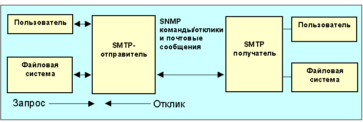 Рис. 4.4.14.1 Схема взаимодействия различных частей почтовой системы Для решения поставленной задачи SMTP-сервер должен знать имя конечного получателя и название почтового ящика места назначения. Аргументом команды MAIL является адрес отправителя (обратный адрес). Аргументом команды RCPT служит адрес конечного получателя. Обратный адрес используется для посылки сообщения в случае ошибки. Все отклики имеют цифровые коды. Команды, отклики и имена ЭВМ не чувствительны к тому, строчные или прописные символы использованы при их написании. Это не всегда справедливо при написании имен и адресов получателя. Многие почтовые системы работают только с ASCII-символами. Если транспортный канал работает с октетами, 7-битные коды будут дополнены нулевым восьмым битом. Именно здесь коренилась проблема пересылки почтовых сообщений на русском языке несколько лет назад(русский алфавит требует 8-битового представления). Как уже было сказано, процедура отправки почтового сообщения начинается с посылки команды MAIL, которая имеет формат: MAIL где Эта команда сообщает SMTP-получателю, что стартует новая процедура и следует сбросить в исходное состояние все статусные таблицы, буферы и т.д. Если команда прошла, получатель реагирует откликом: 250 OK. Аргумент После прохождения команды MAIL посылается команда RCPT: RCPT Эта команда указывает адрес конечного получателя ( Аргумент DATA При правильном приеме этого сообщения SMTP-сервер реагирует посылкой отклика 354 Intermediate reply (промежуточный отклик), и рассматривает все последующие строки в качестве почтового текста. При получении кода конца текста отправляется отклик: 250 OK. Признаком конца почтового сообщения является точка в самом начале строки, за которой следует В некоторых случаях адрес места назначения может содержать ошибку, но получатель знает правильный адрес. Тогда возможны два варианта отклика: 1. 251 User not local; will forward to Это означает, что получатель берет на себя ответственность за доставку сообщения. Это случается, когда адресат, например, мигрировал в другую субсеть в пределах зоны действия данного почтового сервера. 2. 551 User not local; please try Получатель знает правильный адрес и предлагает отправителю переадресовать сообщение по адресу SMTP имеет команды для проверки корректности имени адресата (VRFY) и расширения списка адресов (EXPN). Обе команды в качестве аргументов используют строки символов (в некоторых реализациях эти две команды по своей функции идентичны). Для команды VRFY параметром является имя пользователя, а отклик может содержать его полное имя и адрес его почтового ящика. Реакция на команду VRFY зависит от аргумента. Так если среди клиентов почтового сервера имеется два пользователя с именем Ivanov, откликом на команду "VRFY Ivanov" будет "553 User ambiguous". В общем случае команда VRFY Ivanov может получить в качестве откликов: 250 Vasja Ivanov Ivanov@cl.itep.ru В случае пропечатки списка адресов отклик занимает несколько строк, например: