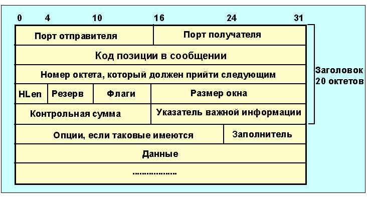 Протокол TCP (transmission control protocol, RFC-793, -1323) в отличии от udp осуществляет доставку дейтограмм, называемых сегментами, в виде байтовых потоков с установлением соединения. Протокол TCP применяется в тех случаях, когда требуется гарантированная доставка сообщений. Он использует контрольные суммы пакетов для проверки их целостности и освобождает прикладные процессы от необходимости таймаутов и повторных передач для обеспечения надежности. Для отслеживания подтверждения доставки в TCP реализуется алгоритм "скользящего" окна. Наиболее типичными прикладными процессами, использующими TCP, являются FTP (file transfer protocol - протокол передачи файлов) и telnet. Кроме того, TCP используют системы SMTP, HTTP, X-windows, RCP (remote copy), а также "r"-команды. Внутренняя структура модуля TCP гораздо сложнее структуры UDP. Подобно UDP прикладные процессы взаимодействуют с модулем TCP через порты (см. таблицу 4.4.2.1 в предыдущей главе). Под байтовыми потоками здесь подразумевается то, что один примитив, например, read или write (см. раздел "Программирование для сетей") может вызвать посылку адресату последовательности сегментов, которые образуют некоторый блок данных (сообщение). Примером прикладного процесса, использующего ветвь TCP, может служить FTP, при этом будет работать стек протоколов ftp/tcp/ip/ethernet. Хотя протоколы UDP и TCP могли бы для сходных задач использовать разные номера портов, обычно этого не происходит. Модули TCP и UDP выполняют функции мультиплексоров/демультиплексоров между прикладными процессами и IP-модулем. При поступлении пакета в модуль IP он будет передан в TCP- или UDP-модуль согласно коду, записанному в поле протокола данного IP-пакета. Формат сегмента (пакета) tcp представлен ниже на рис. 4.4.3.1. Если IP-протокол работает с адресами, то TCP, также как и UDP, с портами. Именно с номеров портов отправителя и получателя начинается заголовок TCP-сегмента. Поле код позиции в сообщении определяет порядковый номер первого октета в поле данных пользователя. При значении флага syn=1 в этом поле лежит код isn (смотри ниже описание процедуры установления связи). Поле HLEN - определяет длину заголовка сегмента, которая измеряется в 32-разрядных словах. Далее следует поле резерв, предназначенное для будущего использования, в настоящее время должно обнуляться. Поле размер окна сообщает, сколько октетов готов принять получатель (флаг ACK=1). Окно имеет принципиальное значение, оно определяет число сегментов, которые могут быть посланы без получения подтверждения. Значение ширины окна может варьироваться во время сессии (смотри описание процедуры "медленного старта"). Значение этого поля равное нулю также допустимо и указывает, что байты вплоть до указанного в поле номер октета, который должен прийти следующим, получены, но адресат временно не может принимать данные. Разрешение на посылку новой информации может быть дано с помощью посылки сегмента с тем же значением поля номер октета, который должен прийти следующим, но ненулевым значением поля ширины окна. Поле контрольная сумма предназначено для обеспечения целостности сообщения. Контрольное суммирование производится по модулю 1. Перед контрольным суммированием к TCP-сегменту добавляется псевдозаголовок, как и в случае протокола udp, который включает в себя адреса отправителя и получателя, код протокола и длину сегмента, исключая псевдозаголовок. Поле указател