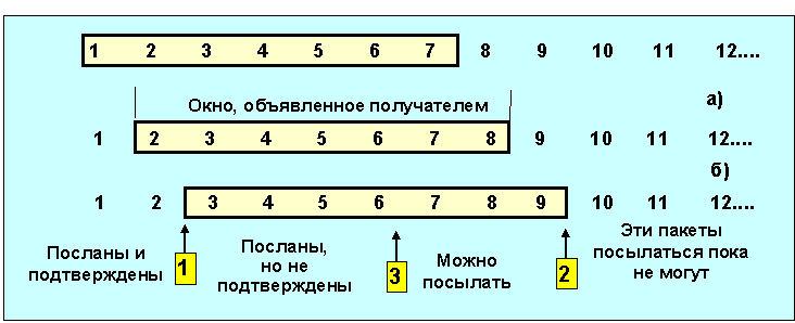 Рис. 4.4.3.5. Схема использования скользящего окна После прихода отклика на пакет <1> окно смещается вправо на одну позицию. Теперь отправитель может послать и пакет <8>. Если порядок прихода откликов нарушается, сдвиг окна может задержаться. Размер окна в сегментах определяется соотношением: window > RTT*B/MSS, где B - полоса пропускания канала в бит/с, а MSS - максимальный размер сегмента в битах, а window - в сегментах. Для протокола TCP механизм скользящего окна может работать на уровне октетов или сегментов. В первом случае нужно учитывать каждый раз размер поля данных переданного и подтвержденного сегмента. В TCP-протоколе используется три указателя (стрелки на рис. 4.4.3.3б): Первый указатель определяет положение левого края окна, отделяя посланный сегмент, получивший подтверждение, от посланного сегмента, получение которого не подтверждено. Второй указатель отмечает правый край окна и указывает на сегмент, который может быть послан до получения очередного подтверждения. Третий указатель помечает границу внутри скользящего окна между уже посланными сегментами и теми, которые еще предстоит послать. Получатель организует аналогичные окна для обеспечения контроля потока данных. Если указатель 3 совпадет с указателем 2, отправитель должен прервать дальнейшее отправление пакетов до получения хотя бы одного подтверждения. Обычно получатель посылает одно подтверждение (ACK) на два полученных сегмента. Регулирование трафика в TCP подразумевает существование двух независимых процессов: контроль доставки, управляемый получателем с помощью параметра window, и контроль перегрузки, управляемый отправителем с помощью окна перегрузки cwnd (congestion window) и ssthreth (slow start threshold). Первый процесс отслеживает заполнение входного буфера получателя, второй - регистрирует перегрузку канала, а также связанные с этим потери и понижает уровень трафика. В исходный момент времени при установлении соединения cwnd делается равным одному MSS, а ssthreth=65535 байтам. Программа, управляющая пересылкой, никогда не пошлет больше байт, чем это задано cwnd и объявленным получателем значением window. Когда получение очередного блока данных подтверждено, значение cwnd увеличивается. Характер этого увеличения зависит от того, осуществляется медленный старт или реализуется процедура подавления перегрузки. Если cwnd меньше или равно ssthreth, выполняется медленный старт, в противном случае осуществляется подавление перегрузки. В последнем случае cwndi+1 = cwndi + MSS/8 +(MSS*MSS)/cwnd. Если возникает состояние перегрузки канала значение cwnd снова делается равным одному MSS. В качестве модуля приращения cwnd используется MSS. При получении подтверждения (ACK) окно перегрузки увеличивается на один сегмент ("медленный старт", CWNDi+1 = CWNDi + размер_сегмента, последнее слагаемое нужно, если размер окна задан в октетах, в противном случае вместо него следует использовать 1) и теперь отправитель может послать, не дожидаясь ACK, уже два сегмента и т.д.. Ширина окна, в конце концов, может стать настолько большой, что ошибка доставки в пределах окна станет заметной. Тогда будет запущена процедура "медленного старта" или другой алгоритм, который определит новое, уменьшенное значение окна. Окно перегрузки позволяет управлять информационным потоком со стороны отправителя, блокируя возможные перегрузки и потери данных в промежуточных узлах сети (о др