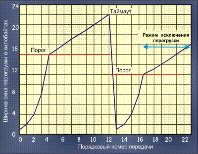 Когда оператор, работая в диалоговом режиме, нажимает командную клавишу, сегмент, в который помещается эта управляющая последовательность, помечается флагом PSH (push). Это говорит приемнику, что информация из этого сегмента должна быть передана прикладному процессу как можно скорее, не дожидаясь прихода еще какой-либо информации. Сходную функцию выполняет флаг URG. URG позволяет выделить целый массив данных, так как активизирует указатель последнего байта важной информации. Будет ли какая-либо реакция на эту "важную" информацию определяет прикладная программа получателя. urg-режим используется для прерываний при работе с FTP, telnet или rlogin. Если до завершения обработки "важной" информации придет еще один сегмент с флагом URG, значение старого указателя конца "важного" сообщения будет утеряно. Это обстоятельство должно учитываться прикладными процессами. Так telnet в командных последовательностях всегда помещает префиксный байт с кодом 255. В режиме удаленного терминала (telnet) при нажатии любой клавиши формируется и поcылается 41-октетный сегмент (здесь не учитываются издержки ethernet), который содержит всего один байт полезной информации. Эффективность работы может быть улучшена с помощью алгоритма Нагля (Nagle, 1984; RFC-896). Нагль предложил при однобайтовом обмене посылать первый байт, а последующие буферизовать до прихода подтверждения получения посланного. После этого посылаются все буферизованные октеты, а запись в буфер вводимых кодов возобновляется. Если оператор вводит символы быстро, а сеть работает медленно, этот алгоритм позволяет заметно понизить загрузку канала. Встречаются, впрочем, случаи, когда алгоритм Нагля желательно отключить, например, при работе в Интернет в режиме Х-терминала, где сигналы перемещения мышки должны пересылаться немедленно, чтобы не ввести в заблуждение пользователя относительно истинного положения маркера. Существует еще одна проблема при пересылке данных по каналам TCP, которая называется синдром узкого окна (silly window syndrome; Clark, 1982). Такого рода проблема возникает в том случае, когда данные поступают отправителю крупными блоками, а интерактивное приложение адресата считывает информацию побайтно. Предположим, что в исходный момент времени буфер адресата полон и передающая сторона знает об этом (window=0). Интерактивное приложение считывает очередной октет из TCP-потока, при этом TCP-агент адресата поcылает уведомление отправителю, разрешающее ему послать один байт. Этот байт будет послан и снова заполнит до краев буфер получателя, что вызовет отправку ACK со значением window=0. Этот процесс может продолжаться сколь угодно долго, понижая коэффициент использования канала ниже паровозного уровня. Кларк предложил не посылать уведомление о ненулевом значении ширины окна при считывании одного байта, а лишь после освобождения достаточно большого пространства в буфере. Например, когда адресат готов принять MSS байтов или когда буфер наполовину пуст. Предполагается, что получатель пакета практически всегда посылает отправителю пакет-отклик. Отправитель может послать очередной пакет, не дожидаясь получения подтверждения для предшествующего. Таким образом, может быть послано k пакетов, прежде чем будет получен отклик на первый пакет (протокол "скользящего окна"). В протоколе tcp "скользящее окно" используется для регулировки