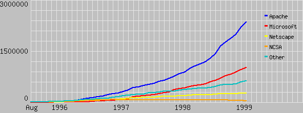Рис. 4.5.6.1. Рост числа web-серверов в период 1995-99 годов На февраль 1999 года число www-серверов равнялось 4.301.512. Что же такое гипертекст? Прежде всего, следует отметить, что гипертекст - это текст, состоящий из ascii-символов. Для обеспечения верстки и организации перекрестных ссылок в гипертексте используются слова-метки. Основу гипертекста составляют HTML-элементы. Такой элемент включает в себя имя, атрибуты, текст или гипертекст. HTML-элемент записывается в документ в виде (более подробное описание смотри в статье о html): <имя_метки> текст </имя_метки> html-документ состоит из одного элемента: <html> .... </html>, который состоит из html-элементов: <head> ... </head> и <body> ... </body>, последние в свою очередь могут содержать различные списки, внутренние и внешние метки и т.д.. Элементы <html>, <head> и <body> для совместимости с более старыми текстами сделаны пока необязательными. В html имеется 6 уровней заголовков (<h1>, .... <h6>), из них первый - главный. В версии HTML+ (и более поздних версиях) предусмотрены операторы позиционирования текста, например, <p align="center">. head-элементы могут содержать в себе: <isindex> говорит о том, что данный документ допускает индексный поиск (база данных). <title> . . . </title> описывает заголовок документа, этот заголовок характеризует содержимое окна. <base href="url"> сообщает имя файла, в котором хранится данный документ. <link rev="relationship" rel="relationship" href="url"> этот элемент позволяет установить связь между документом, содержащим метку (якорь), и документом, указанным в URL (Uniform Resource Locator). Атрибут rel устанавливает связь между HTML-файлом и URL. Атрибут rev (reverse) описывает взаимоотношения между URL и HTML-файлом. Элементы body могут содержать элементы: Текстовые элементы: <p> индицирует конец параграфа и начало нового. <pre> . . . </pre> выделяет текст, который уже был сформатирован ранее (таблицы, программы, стихи, ...). <blockquote> . . . </blockquote> ограничивает часть текста, который должен быть выделен кавычками. Гиперсвязи или якоря <a name="anchor_name"> . . . </a> определяет заданную позицию в документе. <a href="#anchor_name"> . . . </a> описывает ссылку на определенное место текущего документа. <a href="url"> . . . </a> устанавливает связь с другим файлом или ресурсом. <a href="url#anchor_name"> . . . </a> устанавливает связь с заданным местом в другом документе. <a href="url?search_word+search_word"> . . . </a> посылает серверу эталонную строку для поиска. Различные системы поиска могут интерпретировать эту строку по-разному. Для того чтобы читатель незнакомый с гипертекстом, получил некоторое представление о том, как он выглядит, приведу пример: <title> Протоколы и ресурсы Интернет </title> Вам уже ясно, что подготовка гипертекстов "вручную" изнурительная задача и вспомогательные программные средства не повредят, особенно если вы хотите, чтобы ваш текст выглядел привлекательно. Заметим, что управляющие слова-метки могут записываться как строчными, так и прописными буквами (<H1> = <H1>), но они могут восприниматься различными программами просмотра по-разному (могут и игнорироваться вовсе). HTML поддерживает нумерованные (OL), ненумерованные (UL), и описательные списки (DL). Пример нумерованного списка: