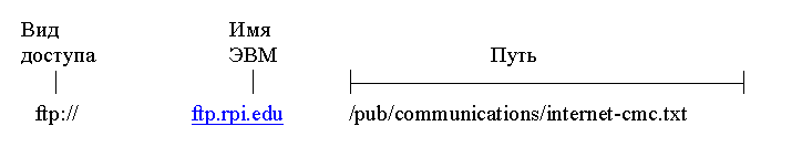 subject catalogues of network information [2]. Цифры в квадратных скобках представляют собой пункты меню. Для выбора одного из них достаточно напечатать его номер (после двоеточия) и нажать клавишу <enter>. Поиск возможен только в случае, когда в меню в нижней части экрана присутствует слово find. Рассмотренная выше версия является устаревшей, но она дает представление о том как работает WEB-сервер. URL (uniform resource locator) идентифицирует ресурс Internet. В общем виде URL имеет вид: access://host/path где access = {FTP, Gopher, Telnet, ...}; host = имя ЭВМ-сервера; path = имя файла, имя каталога, или другая информация о ресурсе. Например, url для анонимного FTP: ftp.rpi.edu/pub/communications/internet-cmc.txt означает: