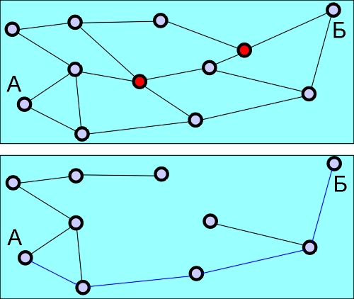 Рис. 4.7. Выбор маршрута нового виртуального канала при наличии перегрузки На рис. 4.7 (верх) показан пример сети с двумя узлами, характеризующимися перегрузкой (помечены красным цветом). Предположим, что необходимо проложить виртуальный канал из узла А в узел Б. Из графа маршрутов удаляются перегруженные узлы, после чего осуществляется прокладка пути. В нижней части рисунка синим цветом показан новый виртуальный канал. Еще более универсальным решение, пригодным для работы с установлением соединения и без, является посылка пакетов блокировки (choke packets). Маршрутизатор обычно контролирует загруженность всех своих внешних каналов l, которая может принимать значения от 0 до 1. Когда l достигает некоторого порогового значения, отправителю посылается пакет блокировки. При вычислении l следует использовать какую-либо методику усреднения, чтобы избежать слишком частых блокировок. Когда отправитель получает пакет блокировки, он должен уменьшить трафик, посылаемый получателю на заданное число процентов. Так как на пути к месту назначения может быть много пакетов, это вызовет серию пакетов блокировки. Отправитель должен игнорировать пакеты блокировки в течение некоторого времени после получения первого такого пакета. По истечении этого периода отправитель прослушивает канал на протяжении аналогичного времени, ожидая получения новых пакетов блокировки. Если такой пакет приходит, канал все еще перегружен и отправитель снова должен понизить темп посылки пакетов. Если на протяжение периода прослушивания не приходит новых пакетов блокировки, отправитель может увеличить поток снова. ЭВМ может понижать трафик, корректируя свои параметры, например, ширину окна или темп передачи на выходе устройства типа "дырявое ведро". Обычно первый блокирующий пакет уменьшает поток вдвое, следующий на 0,25 от первичного и т.д. Увеличение потока также производится аналогичными шагами. Существует большое число вариантов алгоритма управления потоком с использованием пакетов блокировки. Параметром, который контролируется и определяет условие отправки пакета блокировки, может служить длина очереди или заполненность буфера. Ситуация перегрузки не всегда управляется однозначно. Например, при поступлении на вход пакетов от трех источников возможна ситуация, когда приемник посылает блокирующие пакеты всем отправителям, а откликнется сокращением потока только один. В результате этот узел, который "играет по правилам" (как это часто бывает и в жизни) оказывается в проигрыше. В 1987 году Нагле был предложен алгоритм fair queueing (честная очередь). В этом алгоритме маршрутизатор организует независимые очереди для пакетов, поступающих от разных источников. Когда выходной канал маршрутизатора оказывается свободным, он просматривает очереди циклически и отравляет очередной пакет. В результате при n очередях по завершении такого цикла просмотров-посылок оказываются посланы по одному пакету из каждой очереди. Такой алгоритм используется в некоторых ATM-переключателях. Следует заметить, что этот алгоритм дает некоторые преимущества тем узлам, которые посылают более длинные пакеты. Демерс (Demers) и др. в 1990 году предложил некоторое усовершенствоввание алгоритма. В данном варианте организуется циклический просмотр очередей не по-пакетно, а по-байтно. Система последова