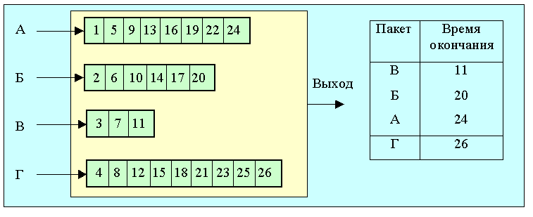 Рис. 4.8. Маршрутизатор с 4-мя входными каналами, в каждом из которых ждет очереди передачи по одному пакету. В правой части рисунка представлен порядок посылки этих пакетов. Пакеты на рисунке имеют от трех до девяти октетов. Порядок пересылки октетов показан в левой части рисунка. В отсутствии поступления новых пакетов, кадры, записанные в буфер будут переданы в порядке, представленном в правой части рисунка. Особенностью этого алгоритма является равенство приоритета всех входных каналов. При передаче данных на большие расстояния с большими значениями RTT эффективность использования метода блокирующих пакетов снижается. Пока блокирующий пакет дойдет через ряд промежуточных узлов до отправителя, на вход получателя поступит большое число пакетов, которые не только усугубят ситуацию перегрузки, но и могут вызвать потерю какой-то их доли, что, в свою очередь, может потребовать повторной пересылки следовавших за ними кадров. Для повышения эффективности часто применяется схема, при которой блокирующие пакеты воздействуют на все маршрутизаторы по пути своего следования. В этом случае снижения потока можно ожидать уже чарез время, равное RTT до узла, ближайшего к получателю пакетов. Такая схема требует того, чтобы все промежуточные узлы имели достаточно емкие буферы, в противном случае возможны потери. В протоколе TCP используется алгоритм управления трафиком, называемый "скользящее окно". Здесь размер окна, которое определяет число сегментов, посылаемых без получения подтверждения, варьируется в зависимости от наличия потерь пакетов. При большой вероятности потери система переходит в режим, когда очередной пакет не посылается до тех пор, пока не будет подтверждено получение предшествующего. При серьезных перегрузках, когда потери становятся значительными, нарушается механизм вычисления значений RTT и таймаутов, что может приводить к трудно предсказуемым последствиям. Следует обратить внимание, что в протоколе UDP какого-либо механизма управления трафиком не предусмотрено. По этой причине для некоторых мультимедийных задач, следует предусматривать другие, например, ICMP-способы подавления перегрузки. В приложениях типа NFS, где используется UDP, для подавления перегрузки используется упомянутый выше ICMP-механизм. К сожаления в ряде мультимедийных приложений потеря пакетов не контролируется (например IP-телефония). Там шлюз 100-10Мбит/с может восприниматься как канал с вероятностью потери пакета 90%. Если другие способы испробованы, а перегрузка не исчезла, маршрутизатор начинает отбрасывать приходящие пакеты, которые уже не может обработать. Самое простое - это предоставить случаю выбор отбрасываемых пакетов. Но это не лучшая тактика. В случае пересылки мультимедийных данных предпочтение следует делать для последних полученных пакетов, а "старые" пакеты выбрасывать. При передаче файлов наоборот "старый" пакет имеет приоритет, ведь если его отбросить, придется повторно передавать не только его, но и все последующие пакеты. Некоторые методы передачи изображения требуют передачи время от времени всего кадра с последующей пересылкой только фрагментов, где произошли изменения. В таких условиях потеря пакета, составляющего базовый кадр, менее желательна. Сходные обстоятельства могут возникать и в других приложениях. Можно помечать 