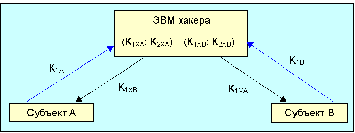 Рис. 6.4.1. Если хакер умудрится вставить свою ЭВМ в разрыв канала, соединяющего субъектов А и В, у него появляется возможность перехватывать в том числе и шифрованные сообщения. Пусть субъект А сформировал пару ключей К1А и К2А (ключ с индексом 2 является секретным), аналогичную пару ключей сгенерировал субъект В (К1В и К2В ). Хакер же тем временем подготовил две пары ключей (К1ХА:К2ХА и К1ХВ:К2ХВ ). Когда субъект А пошлет открытый ключ К1А субъекту В, хакер его подменит ключом К1ХА . Аналогичную процедуру он проделает с ключом К1В, посланным от В к А. Теперь сообщение А к В, зашифрованное с помощью ключа К1ХА будет послано В. Хакер его перехватывает, дешифрует с помощью ключа К2ХА, шифрует с помощью ключа К1ХВ и посылает В. Субъект В, получив послание, дешифрует его с помощью "секретного" ключа К2ХВ, полученного от хакера (о чем он, естественно, не подозревает). Аналогичная процедура будет проведена и при посылки сообщения от В к А. В сущности единственным параметром который изменится существенным образом будет время доставки сообщения, так как это время будет включать дешифровку и повторную шифровку сообщения. Но при использовании быстродействующей ЭВМ и при работе с традиционной электронной почтой это может оказаться незаметным. Понятно, что между А и В появится дополнительный шаг (hop). Но и это может быть легко замаскировано под прокси сервер или Firewall. Решить эту проблему можно путем пересылки открытого ключа своему партнеру по какому-то альтернативному каналу или сверки его по телефону. Полезную информацию по системам шифрования можно получить на следующих серверах: