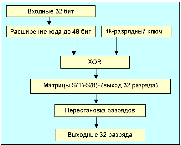 Рис. 6.4.1.1. Алгоритм работы функции f Преобразование начинается с перестановки бит (IP - Initial Permutation) в 64-разрядном блоке исходных данных. 58-ой бит становится первым, 50-ый - вторым и т.д. Схема перестановки битов показана ниже. 58 50 42 34 26 18 10 2 Полученный блок делится на две 32-разрядные части L0 и R0. Далее 16 раз повторяются следующие 4 процедуры: