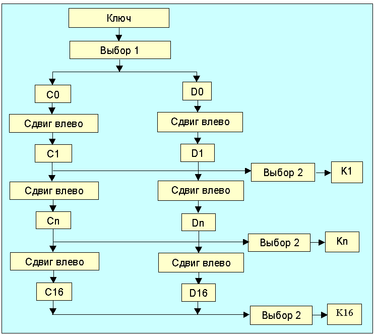 Рис. 6.4.1.3. Алгоритм вычисления последовательности ключей Kn Для описания алгоритма вычисления ключей Kn (функция KS) достаточно определить структуру "Выбора 1" и "Выбора 2", а также задать схему сдвигов влево (табл. 6.4.1.2). "Выбора 1" и "Выбора 2" представляют собой перестановки битов ключа (PC-1 и PC-2; табл. 6.4.1.1). При необходимости биты 8, 16,., 64 могут использоваться для контроля четности. Для вычисления очередного значения ключа таблица делится на две части С0 и D0. В С0 войдут биты 57, 49, 41,., 44 и 36, а в D0 - 63, 55, 47,., 12 и 4. Так как схема сдвигов задана (табл. 6.4.1.2) C1,D1; Cn, Dn и так далее могут быть легко получены из C0 и D0. Так, например, C3 и D3 получаются из C2 и D2 циклическим сдвигом влево на 2 разряда Таблица 6.4.1.1