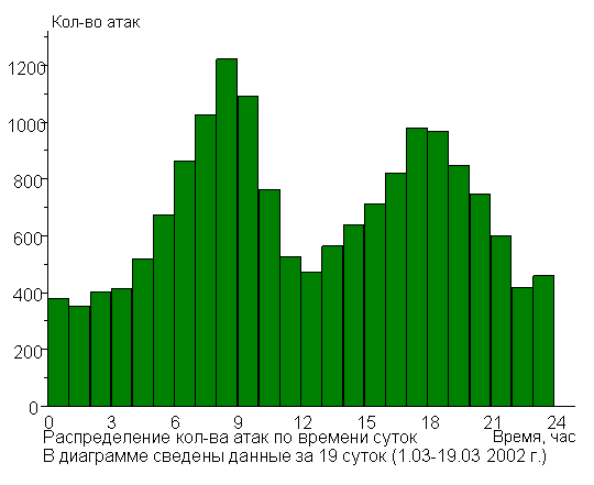 На рис.3 показана зависимость числа атак от времени суток, полученная за 19 дней.