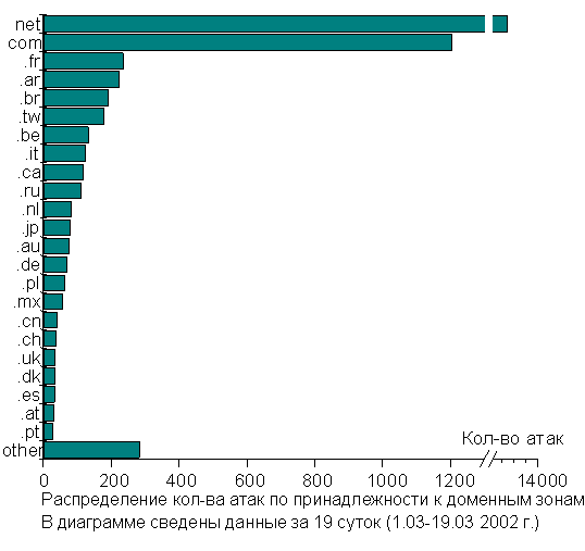 На рис.4 показано распределение атак по доменным зонам. Из распределения видно, что этому занятию предаются чаще всего "жители" больших и комерческих сетей. Хотя нельзя исключить, что именно они являются чаще жертвами хакеров.