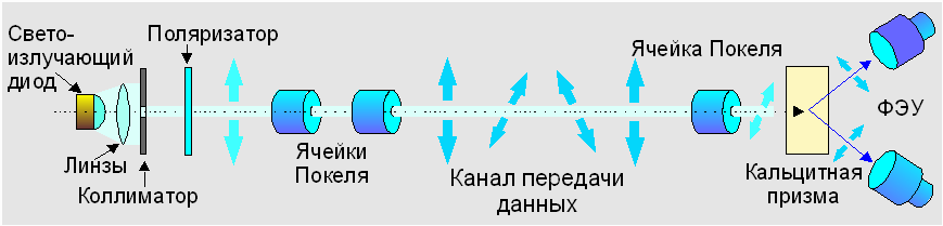 Схема реализация однонаправленного канала с квантовым шифрованием показана на рис. .1. Передающая сторона находится слева, а принимающая - справа. Ячейки Покеля служат для импульсной вариации поляризации потока квантов передатчиком и для анализа импульсов поляризации приемником. Передатчик может формировать одно из четырех состояний поляризации (0, 45, 90 и 135 градусов). Собственно передаваемые данные поступают в виде управляющих сигналов на эти ячейки. В качестве канала передачи данных может использоваться оптическое волокно. В качестве первичного источника света можно использовать и лазер.