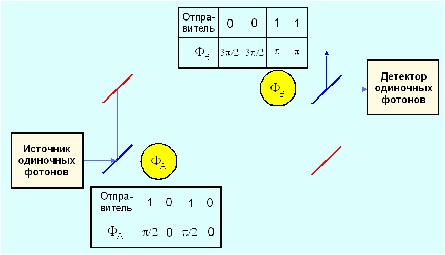 В алгоритме В92 приемник и передатчик создают систему, базирующуюся на интерферометрах Маха-Цендера. Отправитель определяет углы фазового сдвига, соответствующие логическому нулю и единице (F A=p/2), а приемник задает свои фазовые сдвиги для логического нуля (F B=3p/2) и единицы (F B=p). В данном контексте изменение фазы 2p соответствует изменению длины пути на одну длину волны используемого излучения. Хотя фотоны ведут себя при детектировании как частицы, они распространяются как волны. Вероятность того, что фотон, посланный отправителем, будет детектирован получателем равна
