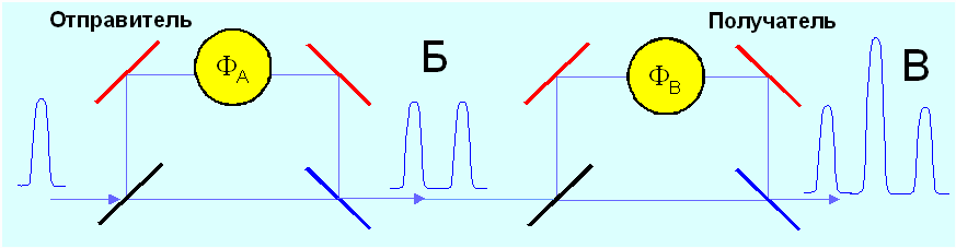 В этом варианте отправитель и получатель имеют идентичные неравноплечие интерферометры Маха-Цендера (красным цветом отмечены зеркала). Разность фаз длинного и короткого путей DT много больше времени когерентности светового источника. По этой причине интерференции в пределах малых интерферометров не происходит (Б). Но на выходе интерферометра получателя она возможна (В). Вероятность того, что фотонные амплитуды сложатся (центральный пик выходного сигнала интерферометра В) равна
