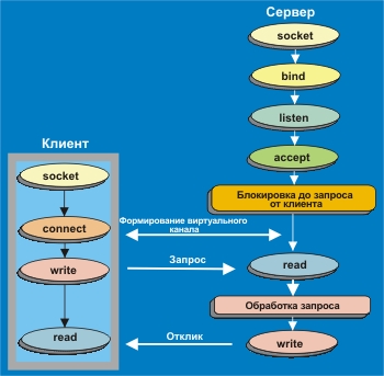 struct sockaddr { Параметр namlen определяет длину второго параметра. В рамках этой идеологии легко реализовать систему клиент-сервер. IP-адрес может быть сделан равным INADDR_ANY (или =0), если ЭВМ имеет несколько интерфейсов. При номере порта равным нулю, windows socket присвоит порту уникальный номер в диапазоне 1024-5000. Приложение может выполнить операцию getsockname после bind, чтобы определить присвоенный адрес. Оператор bind выполняется до операций connect или listen. При корректном выполнении оператор bind возвращает код 0 (r=0), в противном случае SOCKET_ERROR=-1. Команда bind выдается для записи собственного номера порта. Сервер генерирует команду bind, чтобы подготовить определенный вид связи (например, FTP), и пассивно ожидает запроса connect со стороны клиента: R=connect(s, const struct socketaddr FAR*name, int namelen), где s - дескриптор соединителя, name - идентификатор адреса места назначения (указатель на структуру данных), а namelen - длина этого адреса. Таким образом, оператор connect сообщает ip-адрес и номер порта удаленной ЭВМ. Если адресное поле структуры name содержит нули, оператор connect вернет ошибку WSAEADDRNOTAVAIL (или SOCKET_ERROR=-1). Установка в режим ожидания осуществляется командой listen, которая организует очередь запросов: R=listen(s, int backlog), где backlog - задает максимальный размер очереди для приходящих запросов соединения (то есть сколько запросов может быть принято на обслуживание без потерь, обычно этот параметр равен 5). При переполнении очереди будет послано сообщение об ошибке. Следует иметь в виду, что клиент, ориентированный на соединение, также должен прослушивать порт протокола, ожидая появления дейтограмм-откликов. Ожидающий соединитель посылает каждому отправителю сообщение-отклик, подтверждающее получение запроса на соединение. Оператор listen подготавливает соединитель к обработке потока запросов, система должна быть достаточно быстродействующей. Запросы из очереди извлекаются оператором accept: R=accept(s, struct sockaddr FAR*addr, int FAR*addrlen), где s - дескриптор соединителя, который прослушивает соединение (тот же, что и в listen), addr - опционный указатель на структуру, которая содержит адрес, addrlen - код длины адреса. Оператор accept позволяет серверу принять запрос от клиента. Когда входная очередь сформирована, программа реализует процедуру accept и переходит в режим ожидания запросов. Программа извлекает первый элемент очереди, создает новый соединитель со свойствами, идентичными s, и при успешном выполнении возвращает дескриптор нового соединителя. При возникновении ошибки возвращается код INVALID_SOCKET. По окончании обработки запроса сервер вновь вызывает accept, который возвращает ему дескриптор соединителя очередного запроса, если таковой имеется. Если очередь пуста, accept блокирует программу до получения связи. Существуют серверы с параллельной и последовательной обработкой запросов. Параллельный обработчик запросов не ждет завершения обработки предшествующего запроса и вызывает оператор accept немедленно. В системе Unix используются обычно параллельные обработчики запросов. Схема взаимодействия различных операторов winsock в рамках идеологии клиент/сервер для случая процедур, ориентированных на соединение, показана на рисунке 7.1. Стрелками обозначены направления посылки сетевых сообщений. Следует иметь в виду, что программе клиента (выделена рамкой) не нужно знать номер порта, по этой причине она не обращается к процедуре bind, а д