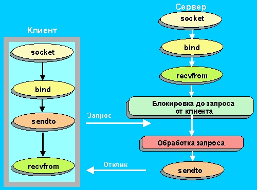 Рис. 7.3. Формат информационной структуры msg_struc Взаимодействие операторов winsock для систем, не ориентированных на соединение, показано на рисунке 7.4. Здесь также как и в случае, ориентированном на соединение, сервер вызывает socket и bind, после чего обращается к процедуре recvfrom (вместо read или recv). Программа-клиент в данной схеме обращается к оператору bind и совсем не использует оператор connect (ведь предварительного соединения не нужно). Для передачи запросов и приема откликов здесь служат операторы sendto и recvfrom, соответственно.