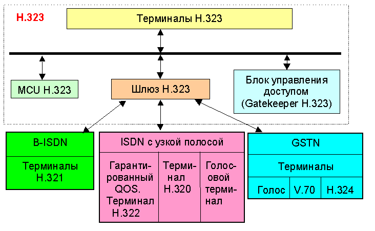 При видеоконференциях используется технология codec (coder/decoder) для выделенных и телефонных коммутируемых линий (>56 Кбит/с, интерфейс V35), применим и режим коммутации пакетов (multicast backbone, >256 Кбит/с). Перечень стандартов, регламентирующих протоколы видеоконференций можно найти в следующем разделе (2.9.1). Но базовым протоколом для работы в локальных сетях, где не гарантируется нужный уровень qos), является h.323 (1996-98 гг.; вторая дата относится к принятию версии 2). Этот стандарт обеспечивает видеоконференции для соединений точка-точка и для многоточечных топологий в рамках стека протоколов tcp/ip, он регламентирует и принципы сжатия видео и аудио информации. Привлекательность стандарта заключается в том, что он применим к уже существующей инфраструктуре телекоммуникаций с широкими вариациями задержек отклика. Способствует этому возрастающая пропускная способность локальных (fast ethernet и gigabit ethernet) и региональных сетей (SDH, ATM, FDDI, Fibre Channel и т.д.). Способствуют этому как новейшие протоколы из семейства IP - RTP и RSVP, так и поддержка H.323 такими компаниями как Intel, Microsoft, Cisco и IBM. H.323 не привязан ни к одной операционной системе и не предполагает использования какого-либо специализированного оборудования. На рис. 2.9.2 показана структура системы H.323 и основных ее компонентов.