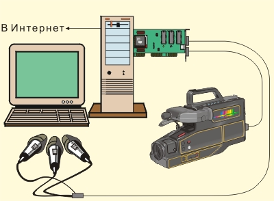 Рис. 2.9.1. Оборудование, необходимое для видеоконференций Для проведения видеоконференции необходимо иметь цифровой канал с пропускной способностью не менее 56-128кбит/с. Если канал не позволяет, можно ограничиться аудио телеконференцией (см. раздел IP-phone). Схеме оборудования, необходимого для видеоконференции показано на рис. 2.9.1. Помимо стандартного оборудования рабочей станции (как правило, под ОС UNIX) требуется интерфейс для подключения видеокамеры и микрофонов. Этот интерфейс обычно снабжается аппаратной схемой сжатия видео и аудио данных. Многие современные мультимедиа интерфейсы снабжены входами для видеокамеры. Из обязательного оборудования на рис. 2.9.1 не показаны наушники и звуковые колонки. Полезным дополнением может служить сканнер, который позволит с высоким разрешением передать изображения документов или чертежей, видеомагнитофон, а также видео проектор для отображений принятого изображения на экране или телевизор с большим экраном. Видеоконференции обеспечивают не только "живое" общение партнеров, но также оперативное обсуждение и редактирование чертежей и документов. При этом разрешающая способность может превышать в 10-100 раз ту, которая доступна для факсов. Реализовать видеоконференцию можно разными путями, из них два наиболее реальны: