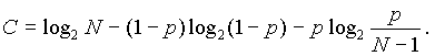 Предположим далее, что имеется лишь конечное число N различных входных сигналов х1 и нет никаких ограничений на вероятности P{ x 1 = x1}, x1 О X1. Кроме того, предположим, что передаваемые сигналы принимаются без искажений, то есть с вероятностью 1 x 2= x 1 . Тогда емкость канала выражается формулой C = log 2N, т.е. передаваемое количество информации I( x 1, x 2 ) будет максимальным в том случае, когда сигналы x1 О X1 равновероятны. Если сообщения