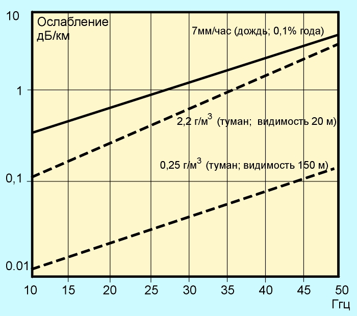Рис. 3.3.1а. Зависимость поглощающей способности земной атмосферы от длины волны Из рисунка видно, что заметную роль в поглощении радиоволн играет вода. По этой причине сильный дождь, град или снег могут привести к прерыванию связи. Поглощение в атмосфере ограничивает использование частот более 30 ГГц. Атмосферные шумы, связанные в основном с грозовыми разрядами, доминируют при низких частотах вплоть до 2 МГц. Галактический шум, приходящий из-за пределов солнечной системы дает существенный вклад вплоть до 200 ГГц. Зависимость поглощения радиоволн в тумане и дожде от частоты показана на рис. 3.3.2.