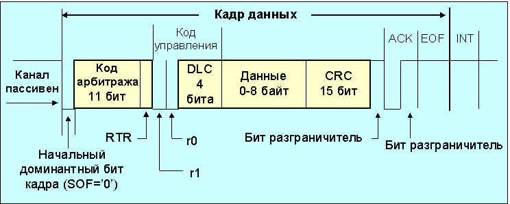 Информационные кадры и удаленные запросы могут использовать как стандартные, так и расширенные форматы кадров (2.0a и 2.0b). Кадр удаленного запроса может иметь стандартный и расширенный форматы. В обоих случаях он содержит 6 полей: SOF, поле арбитража, поле управления, CRC, поля ACK и EOF. Для этого типа кадров бит RTR=1, а поле данных отсутствует вне зависимости от того, какой код содержится в субполе длины. Кадр сообщения об ошибке имеет только два поля - суперпозиция флагов ошибки и разграничитель ошибки. Флаги ошибки бывают активными и пассивными. Активный флаг состоит из шести нулевых бит, а пассивный - из шести единиц. Суперпозиция флагов может содержать от 6 до 12 бит. Разграничитель ошибки состоит из восьми единичных бит. Кадр перегрузки включает в себя два поля - перпозиция флагов перегрузки и разграничитель перегрузки (8 бит =1). В поле флаг ерегрузки записывается 6 бит, равных нулю (как и в поле флаг активной ошибки). Кадры ошибки или перегрузки не требуют межкадровых разделителей. Существует ряд условий перегрузки, каждое из которых вызывает посылку такого кадра: