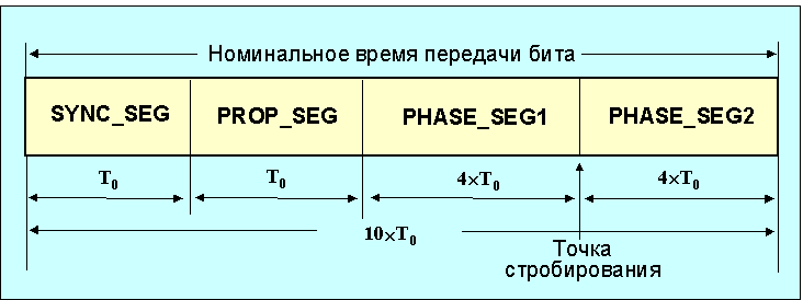 Рис. 4.1.4.3 Временные зоны периода передачи одного бита Первая временная область (SYNC_SEG) служит для синхронизации работы различных узлов сети. Область PROP_SEG предназначена для компенсации временных задержек в сети и равна сумме времени распространения сигнала по каналу и задержки во входных компараторах. PHASE_SEG1 и PHASE_SEG2 служат для компенсации фазовых ошибок и могут увеличиваться или уменьшаться после синхронизации. T0 - минимальный квант времени, используемый для формирования временной шкалы в пределах периода передачи одного бита (длительность внутреннего такта может быть значительно короче). Момент стробирования определяет момент времени, когда проверяется состояние канала. Этот момент должен быть синхронным для всех узлов сети. Длительность этих временных областей может задаваться программно. Чем длиннее канал, тем меньшую скорость передачи информации он может обеспечить (см. табл. 3.3.4.2). Таблица 4.1.4.2 Зависимость пропускной способности канала от его длины