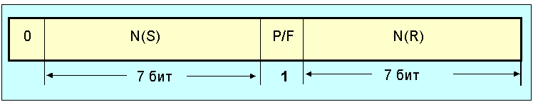 Рис. 4.3.1.3. Формат поля управления I-кадра (нумерация по модулю 128) \N(S) и N(S) представляют собой поля номера кадров. N(R) - номер текущего кадра, а N(R) - номер следующего кадра, который отправитель текущего кадра ожидает получить. При несоответствии ожидаемого номера и полученного возникает ошибка. Если используется нумерация кадров по модулю 8, то максимальное число кадров, не получивших подтверждение не может превышать 7, а размер полей N(S) и N(R) равен трем бит. Это справедливо и для s-кадров. i, s и u-кадры могут иметь обычный (один байт) и расширенный (2 байта) форматы. Младший бит (1) расположен слева. Поле P/F - флаг опрос/окончание опроса. Информационный (I) кадр содержит поле информация (см. рис. 4.3.1.2). Формат S- кадра показан на рис. 4.3.1.4.