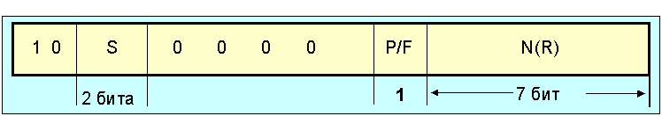 Рис. 4.3.1.4. Формат поля управления s-кадра (расширенный вариант) Для однобайтовой версии s-кадра за полем s следует непосредственно поле P/F. Поле S определяет тип управляющего кадра (см. таблицу 4.3.1.1): Таблица 4.3.1.1. Коды поля S
