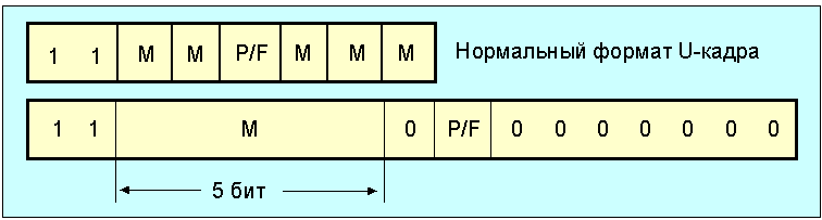 S-кадры служат для передачи сигналов подтверждения, запросов повторной передачи или прекращения посылки кадров из-за блокировки приема в местной станции. При получении кадра с неверным порядковым номером (напр., предшествующий кадр потерян), приемник посылает S-кадр REJ, что означает необходимость повторной посылки предшествующего кадра и всех последующих. Кадр SREJ(n) указывает на то, что все кадры до n-1, включительно, доставлены без ошибок, а при доставке кадра n допущена ошибка и он должен быть послан повторно. В отличии от rej запрашивается пересылка только одного кадра. Связь с терминалом является временной, если бит P/F равен 1. Если адрес места назначения равен 11111111, то обращение является широковещательным. Формат U-кадра представлен на рис. 4.3.1.5.