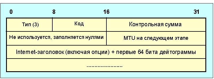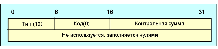 Рис. 4.4.4.3. Формат ICMP-сообщения "адресат не достижим" Поле код содержит целое число, проясняющее положение дел. Перечень кодов таких сообщений помещена в таблице 4.4.4.1. Поле MTU на следующем этапе характеризует максимальную длину пакетов на очередном шаге пересылки. Так как в сообщении содержится Интернет-заголовок и первые 64-бита дейтограммы, легко понять, какой адрес оказался недостижим. Этот тип ICMP-сообщения посылается и в случае, когда дейтограмма имеет флаг DF=1 ("не фрагментировать"), а фрагментация необходима. В поле код в этом случае будет записано число 4. Если буфер приема сообщения переполнен, ЭВМ посылает сообщение типа 4 для каждого из не записанных в буфер сообщений. Так как собственные часы различных ЭВМ имеют свое представление о времени, протокол ICMP, среди прочего, служит для синхронизации работы различных узлов, если это требуется (запросы временных меток). Протокол синхронизации NTP (network time protocol) описан в RFC-1119. Когда дейтограммы поступают слишком часто и принимающая сторона не справляется с этим потоком, отправителю может быть послано сообщение с требованием резко сократить информационный поток (quench-запрос), снижение потока должно продолжаться до тех пор, пока не прекратятся quench-запросы. Такое сообщение имеет формат: