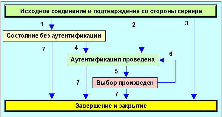 Если невозможно определить, является ли эта сессия первой для данного сообщения, его следует считать относящимся к текущей сессии. Ключевое слово определяется реализацией сервера. Ключевые слова не начинаются с символа "\". Серверы могут позволять клиенту создавать новые ключевые слова в почтовом ящике. Постоянные флаги клиент может устанавливать для данного сообщения или удалять на постоянной основе; таким образом, последующая сессия может воспользоваться новыми значениями флагов. Замечание: Системный флаг \recent имеет статус флага сессии. Флаг \recent не может использоваться в качестве аргумента команды store, и по этой причине не может быть изменен вообще. Внутренняя дата и время сообщения на сервере. Это не та дата и время, которые указаны в заголовке [RFC-822], а время и дата получения сообщения. В случае доставки сообщения посредством протокола [SMTP], это должна быть дата и время доставки конечному адресату. В случае сообщений, доставленных командой IMAP 4.1 copy, это должны быть внутренняя дата и время отправителя сообщения. В случае доставки сообщения командой IMAP 4.1 append, это должна быть дата и время, заданные в описании команды append. Атрибут размера сообщения определяет число октетов в сообщении (рассмотрен в документе [RFC-822]). Атрибут структуры конверта сообщения соответствует требованиям документа [RFC-822]. Атрибут структуры тела сообщения несет в себе информацию о структуре сообщения в соответствии с регламентациями [MIME-IMB]. Кроме доставки текстового сообщения, как это описано в RFC-822, IMAP 4.1 позволяет осуществлять передачу части текста. Можно отдельно доставить заголовок и тело сообщения или даже часть тела сообщения. 2. Состояние и диаграмма исполнения Сервер IMAP 4.1 находится в одном из четырех состояний. Большинство команд допустимо только во вполне определенных состояниях. Если клиент пытается реализовать команду в неправильном состоянии, это рассматривается как протокольная ошибка. В этом случае сервер откликнется командой bad или no в зависимости от реализации конкретной программы. В состоянии без аутентификации клиент должен предоставить имя и пароль, прежде чем станет доступно большинство команд. Переход в это состояние производится при установлении соединения, если только для данного соединения не была проведена предварительная аутентификация. В состоянии аутентификации клиент идентифицирован и должен выбрать почтовый ящик, прежде чем ему станут доступны команды для работы с сообщениями. Переход в это состояние происходит при установлении соединение с предварительной аутентификацией, когда выданы все необходимые идентификационные данные или при ошибочном выборе почтового ящика. В состояние выбора система попадает, когда успешно осуществлен выбор почтового ящика. В состояние выхода система попадает при прерывании соединения в результате запроса клиента или вследствие независимого решения сервера.
