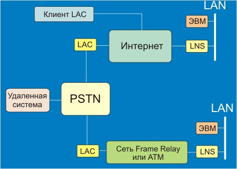 2. Топология На диаграмме (рис. 1.) показана схема работы протокола L2TP. Целью здесь является туннелирование кадров PPP между удаленной системой или клиентом LAC и LNS, размещенной в LAN.