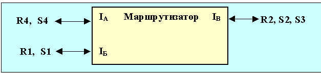 Стиль SE использует опции: "разделенное" (shared) резервирование и "явный" (explicit) выбор отправителя. Таким образом, стиль резервирования SE формирует одно резервирование, которое совместно используется несколькими отправителями. В отличие от стиля WF, SE позволяет получателю непосредственно специфицировать набор отправителей. Запрос резервирования SE, содержащий flowspec Q и список отправителей S1, S2, ... можно представить в символьной форме как: SE((S1,S2,...){Q} ) Разделенное резервирование, выполненное с применением стилей WF и SE, пригодно для мультикастных приложений, где несколько источников данных редко осуществляют передачу одновременно. Пакетная передача голоса может служить примером разделенного резервирования, так как лишь ограниченное число людей говорят одновременно. Каждый получатель может направить запрос резервирования WF или SE на удвоенную полосу пропускания, необходимую одному отправителю, позволяя тем самым говорить обоим партнерам одновременно. С другой стороны стиль FF, который осуществляет четкое резервирование для потоков отдельных отправителей, подходит для передачи видеосигналов. Правила RSVP не позволяют объединять разделенные резервирования с четкими резервированиями, так как эти модели абсолютно несовместимы. Не допускается также объединение явного и произвольного (wildcard) выбора отправителей, так как это может вызвать предоставление незаказанных услуг получателю, который указал тип услуг явно. Таким образом, стили WF, SE и FF не совместимы. Можно моделировать эффект WF резервирования, используя стиль SE. Когда приложение запрашивает WF, процесс RSVP получателя может использовать местный статус для выполнения эквивалентного резервирования SE, которое в явном виде перечисляет всех отправителей. Однако резервирование SE вынуждает классификатор пакетов в каждом узле в явном виде выбрать каждого отправителя из списка, в то время как WF позволяет классификатору пакетов осуществить произвольный выбор отправителя и порта с помощью "wild card". Когда список отправителей велик, стиль резервирования WF обеспечивает значительно меньшие издержки, чем SE. 4. Примеры стилей На рис. 4.4.9.6.2. показан пример маршрутизатора с двумя входными интерфейсами IА и IБ, через которые проходят входные потоки, и двумя выходными интерфейсами IВ и IГ, через которые осуществляется переадресация входных потоков. Пусть существует три отправителя S1 (S2 и S3), подключенные к интерфейсам IА и IБ, соответственно. Имеется три получателя R1 (R2 и R3), которые маршрутизированы через выходные интерфейсы IВ и IГ, соответственно. Будем также предполагать, что интерфейс IГ подключен к широковещательной сети, а R2 и R3 достижимы через разные маршрутизаторы, не показанные на рисунке. Здесь нужно специфицировать мультикастные маршруты в пределах узла, отображенного на рис. 4.4.9.6.2. Предположим сначала, что информационные пакеты от каждого из отправителей Si, показанных на рисунке, маршрутизованы на оба выходных интерфейса. При этих предположениях на рисунках 4.4.9.6.3, 4.4.9.6.4 и 4.4.9.6.5 проиллюстрированы стили резервирования WF, FF и SE, соответственно.