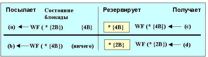 Этот алгоритм объединения обновления применяется отдельно для каждого потока (каждого отправителя или PHOP), вносящего вклад в общее резервирование (стили WF или SE). На рис. 4.4.9.6.11 приведен пример использования состояния блокады для совместного резервирования (стиль WF). Имеется два предшествующих узла, помеченных как (a) и (b), и два последующих узла, помеченных как (c) и (d). Большее резервирование 4B пришло сначала от (c), но "застряло" где-то до PHOP (a), а не по пути через PHOP (b). Рисунок показывает оконечное состояние после меньшего резервирования 2B пришедшего позднее из (d). Это стабильное состояние нарушается каждые Kb*R секунд, когда состояние блокады удаляется по таймауту. Следующее обновление (4B), посылаемое предыдущему узлу (a), предположительно будет отвергнуто, путем посылки сообщения ResvErr, которое восстановит состояние блокады, возвращая ситуацию к тому, что изображено на рисунке. В то же самое время сообщение ResvErr будет направлено следующему узлу (c) и всем получателям, ответственным за резервирование 4B.