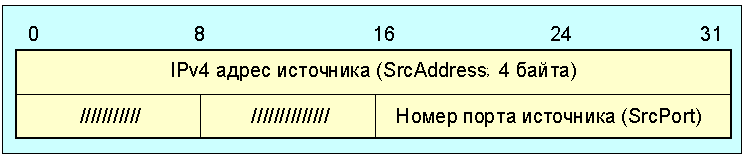 SrcAddress. Это поле характеризует IP-адрес источника для ЭВМ отправителя. Его значение не должно быть равно нулю. SrcPort. UDP/TCP номер порта отправителя, или нуль, указывающий на отсутствие порта. Метка потока. 24-битовое поле метки потока, определенной в IPv6. Этот код может использоваться классификатором пакетов для эффективной идентификации кадров, принадлежащих определенному потоку данных (отправитель-> место назначения). Класс SENDER_TEMPLATE = 11.