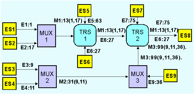 Рис. 4.4.9.2.3 Пример RTP сети с оконечными системами, смесителями и трансляторами Некоторый набор смесителей и трансляторов представлен на рис. 4.4.9.2.3. Здесь показано их влияние на SSRC и CSRC-идентификаторы. Оконечные системы обозначены символами ES и выделены желтым цветом. Трансляторы обозначены буквами TRS (на рисунке овалы голубого цвета) и смесители обозначены как MUX (прямоугольники сиреневого цвета). Запись "M1:13(1,17)" обозначает пакет отправленный смесителем MUX1, который идентифицируется случайным значением SSRC 13 и двумя CSRC-идентификаторами 1 и 17, скопированными с SSRC-идентификаторов пакетов оконечных систем ES1 и ES2. Последовательное включение смесителей В RTP-сессии могут быть задействованы несколько смесителей и трансляторов, как это показано на рис. 4.4.9.2.3. Если два смесителя включены последовательно, так как MUX2 и MUX3, пакеты полученные смесителем могут быть уже объединены и включать CSRC-список со многими идентификаторами. Cмеситель (MUX3) должен формировать CSRC-список для исходящих пакетов, используя CSRC-идентификаторы уже смешанных входных пакетов (выход MUX2) и SSRC-идентификаторы несмешанных входных пакетов, поступивших от ES9 (E:36). Это отмечено на рисунке для выходных пакетов смесителя MUX3 как M3:99(9,11,36). Если число идентификаторов в списке CSRC превышает 15, остальные не могут быть туда включены. SSRC-идентификаторы в RTP-заголовках и в различных полях RTCP-пакетов являются случайными 32-битовыми числами, которые должны быть уникальными в рамках RTP-сессии. Очень важно, чтобы одни и те же числа не были использованы несколькими участниками сессии. Недостаточно использовать в качестве идентификатора локальный сетевой адрес (такой как IPv4), так как может быть не уникальным. Так как RTP трансляторы и смесители допускают работу с сетями, использующими различные адресные пространства, это допускает их случайное совпадение с большей вероятностью, чем в случае использования случайных чисел. Не приемлемо также получать идентификаторы SSRC путем простого обращения к функции random() без тщательной инициализации. Так как идентификаторы выбраны случайным образом, существует малая, но конечная вероятность того, что два или более источников выберут одно и то же число. Столкновение более вероятно, если все источники стартуют одновременно. Если N число источников, а L длина идентификатора (в нашем случае, 32 бита), вероятность того, что два источника независимо выберут одно и то же значение (для больших N [8]) составляет 1 - exp(-N2 / 2(L+1)). Для N=1000, вероятность примерно равна 10-4. Типовое значение вероятности столкновения много меньше худшего случая, рассмотренного выше. Рассмотрим случай, когда новый источник подключается к RTP-сессии, в которой все остальные источники уже имеют уникальные идентификаторы. Если N равно числу источников, а L длина идентификатора, вероятность столкновения равна N / 2L. Для N=1000, вероятность составит около 2*10 -7. Вероятность столкновения уменьшается еще больше в случае, когда новый источник получает пакеты других участников до того, как передаст свой первый пакет. Если новый источник отслеживает идентификаторы других участников, он легко может устранить вероятность конфликта. Преодоление столкновений и детектирование петель Хотя вероятность столкновения идентификаторов SSRC довольно мала, все RTP реализации должны быть готовы обнаруживать столкновения и пр
