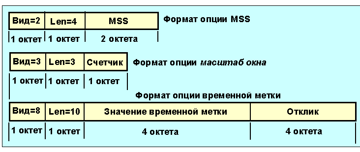 Рис. 4.4.3.2. Формат опций для TCP-сегментов Поле данные в TCP-сегменте может и отсутствовать, характер и формат передаваемой информации задается исключительно прикладной программой, максимальный размер этого поля составляет в отсутствии опций 65495 байт. TCP является протоколом, который ориентируется на согласованную работу ЭВМ и программного обеспечения партнеров, участвующих в обмене информацией. Установление связи клиент-сервер осуществляется в три этапа: