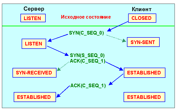 Стандартная процедура установления связи представлена на рисунке 4.4.3.3 (под словом "стандартная" подразумевается отсутствие каких-либо отклонений от штатного режима, например, одновременного открывание соединения со стороны сервера и клиента). Если же соединение одновременно инициируется клиентом и сервером, в конечном итоге будет создан только один виртуальный канал.