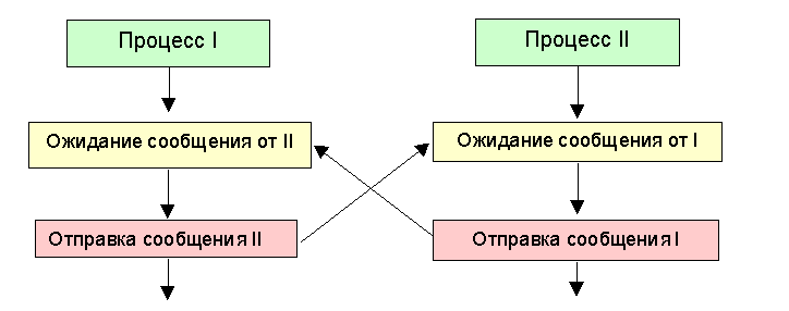 Рис. 4.6. Когда число процессов больше, заметить запрограммированную ситуацию блокировки заметно сложнее. По этой причине необходимо предусмотреть меры препятствующие блокировке, если ожидаемое сообщение не пришло. Необычайно важной проблемой при построении сетей является их устойчивость при возникновении перегрузок. В Интернет для этого используется специальная опция протокола ICMP, а во Frame Relay имеются меры для преодоления перегрузок непосредственно на нижних протокольных уровнях. Оптимальность управления сетью в условиях перегрузок определяет эффективность использования сети. Пока субсеть загружена незначительно, число принимаемых и обрабатываемых пакетов равно числу пришедших. Однако, когда в субсеть поступает слишком много пакетов может возникнуть перегрузка и рабочие характеристики деградируют. При очень больших загрузках пропускная способность канала или сети может стать нулевой (см. [39]) Такая ситуация называется коллапсом сети. Отчасти это может быть связано с недостатком памяти для входных буферов, по этой причине некоторое увеличение памяти может помочь. Но следует помнить, что всякое лекарство хорошо в меру. Еще в 1987 году Нагле (Nagle) обнаружил, что если маршрутизатор имеет даже беспредельную память, эффект перегрузки может оказаться еще более тяжелым. Это сопряжено со временем, которые пакеты ожидают обработки. Если время ожидания в очереди превышает длительность таймаута, появятся дубликаты пакетов, что, безусловно, понижает эффективность системы. Причиной перегрузки может быть медленный процессор или недостаточная пропускная способность какого-то участка сети. Простая замена процессора или интерфейса на более быстродействующий не всегда решает проблему - чаще переносит узкое место в другую часть системы. Перегрузка, как правило, включает механизмы, усиливающие ее негативное воздействие. Так переполнение буфера приводит к потере пакетов, которые позднее должны будут переданы повторно (возможно даже несколько раз). Процессор передающей стороны получает дополнительную паразитную загрузку. Все это указывает на то, что контроль перегрузки является крайне важным процессом. Следует делать различие между контролем потока и контролем перегрузки. Под контролем потока подразумевается балансировка потока отправителя и возможности приема и обработки получателя. Этот вид контроля предполагает наличие обратной связи между получателем и отправителем. В этом процессе участвуют, как правило, только два партнера. Перегрузка же более общее явление, относящееся к сети в целом или к какой-то ее части. Например, 10 ЭВМ хотят передать одновременно какие-то файлы другим 10 ЭВМ. Конфликта потоков здесь нет, каждая из ЭВМ способна переработать поступающие данные, но сеть не может пропустить поток, генерируемый 10 сетевыми интерфейсами одновременно. Часто эти явления не так просто разделить. Отправитель может получить сообщение ICMP (quench) (в случае TCP/IP) при перегрузке получателя или при перегрузке какого-то сегмента сети. Начинать надо с решения проблемы выявления перегрузок. Перегрузкой следует считать ситуацию, когда нагрузка в течение некоторого оговоренного времени превышает заданную величину. Параметрами, которые позволяют судить о наличии перегрузки могут служить: Когда перегрузка выявлена, нужно передать не