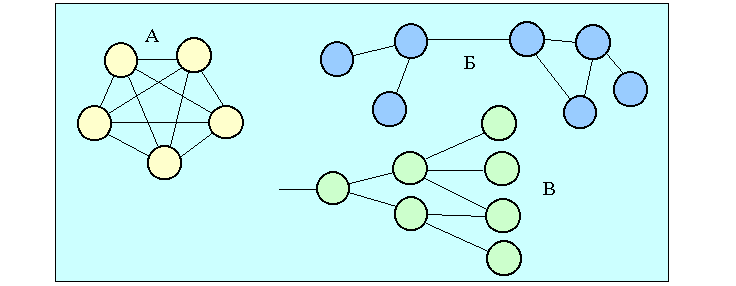 Рис. 4.1. Примеры сетевых топологий К первым трем типам топологии относятся 99% всех локальных сетей. Наиболее популярный тип сети - Ethernet, может строиться по схемам 1 и 2. Вариант 1 наиболее дешев, так как требует по одному интерфейсу на машину и не нуждается в каком-либо дополнительном оборудовании. Сети Token Ring и FDDI используют кольцевую топологию (3 на рис. 4.1), где каждый узел должен иметь два сетевых интерфейса. Эта топология удобна для оптоволоконных каналов, где сигнал может передаваться только в одном направлении (но при наличии двух колец, как в FDDI, возможна и двунаправленная передача). Нетрудно видеть, что кольцевая топология строится из последовательности соединений точка-точка. Используется и немалое количество других топологий, которые являются комбинациями уже названных. Примеры таких топологий представлены на рис. 4.2. Вариант А на рис. 4.2 представляет собой схему с полным набором связей (все узлы соединены со всеми), такая схема используется только в случае, когда необходимо обеспечить высокую надежность соединений. Эта версия требует для каждого из узлов наличия n-1 интерфейсов при полном числе узлов n. Вариант Б является примером нерегулярной топологии, а вариант В - иерархический случай связи (древовидная топология). Если топологии на рис. 4.1 чаще применимы для локальных сетей, то топологии на рис. 4.2 более типичны для региональных и глобальных сетей. Выбор топологии локальной или региональной сети существенно сказывается на ее стоимости и рабочих характеристиках. При этом важной характеристикой при однородной сети является среднее число шагов между узлами d.