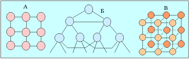 Рис. 4.2. Различные сетевые топологические схемы Современные вычислительные системы используют и другие топологии: решетки (А), кубы (В), гипердеревья (Б), гиперкубы и т.д. (см. рис. 4.3). Но так как некоторые вычислительные системы (кластеры) базируются на сетевых технологиях, я привожу и такие примеры. В некоторых системах топология может настраиваться на решаемую задачу.