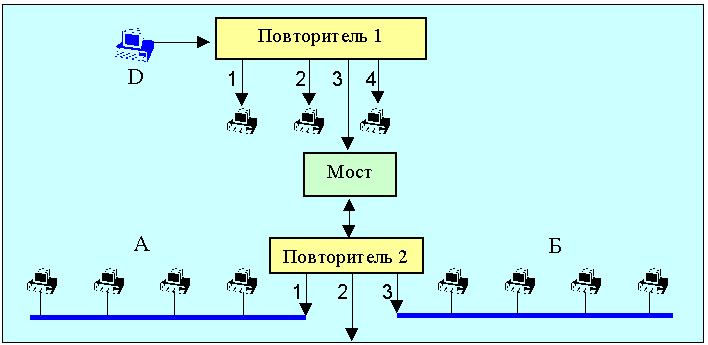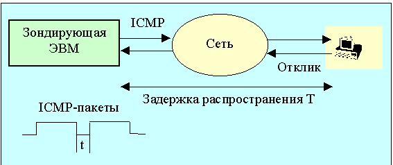 Рис. 5.2.1. Схема, поясняющая диагностические возможности протокола ICMP Пусть диагностическая ЭВМ занимает положение в сети, помеченное буквой D. Сканирующая программа, позволяя проверить доступность любой из ЭВМ, может выявить неисправный вход/выход любого из повторителей, хотя сами эти приборы пассивны и на пакеты ICMP откликов не присылают. Это определяется по наличию или отсутствию отклика от хотя бы одной ЭВМ, подключенной к исследуемому входу/выходу. Так, если ни одна ЭВМ сегмента Б не откликается, то можно сделать вывод, что выход 3 повторителя 2 не исправен (предполагается, что хотя бы одна машина сегмента Б включена). Аналогичным образом можно проверить выходы повторителя 1. Если же не откликаются ЭВМ сегментов А и Б, то весьма вероятен отказ моста. Если же ни одна из ЭВМ, показанных на рисунке, не присылает отклика, а известно, что они включены, то не исправен повторитель 1. Конечно, эту задачу можно решить и с помощью стандартной программы PING, но это займет много больше времени. Администраторы, обслуживающие многомашинные сети, размещенные во многих зданиям, безусловно оценят преимущества сканирующей программы. Сканируя всю сеть периодически в течение суток и регистрируя процент потерь пакетов в сети, можно выявить и неисправные сетевые интерфейсы. Такой интерфейс при включении может портить условия распространения пакетов по сегменту. Обнаружив корреляцию между повышением вероятности потерь пакетов и включением определенной ЭВМ, можно сделать именно такой вывод и позднее независимо исследовать именно этот сетевой интерфейс. Протокол ICMP можно использовать и для измерения размера зоны столкновений, что крайне важно для успешной работы локальной сети, ведь превышение предельного размера зоны приводит к резкому росту числа столкновений. Вычислить размер зоны бывает затруднительно, так как для повторителей и концентраторов довольно часто время задержки не указывается. Разумеется, что оно должно быть меньше предельно допустимого, разрешенного документом 802.3, но кто может дать гарантию? Для решения поставленной задачи следует использовать ICMP пакеты минимальной длины. Программа посылает пакеты ICMP и воспринимает отклики, регистрируя долю потерянных пакетов. Для зондирования выбирается самая удаленная рабочая станция или сервер (см. рис. 5.2.2). Программа должна уметь посылать ICMP-пакеты, не дожидаясь отклика. Пакеты посылаются парами с зазором между ними t. Далее варьируем t и добиваемся максимума вероятности потери пакетов. Зазор t, при котором будет достигнут максимум потерь, соответствует реальному значению задержки, характеризующей зону столкновений для данного логического сегмента сети. Периодическая посылка пакетов слишком сильно перегрузит сеть, именно по этой причине следует периодически посылать пары пакетов. При этом период посылки таких пар должен быть достаточно велик, чтобы исключить влияние процессов восстановления после столкновения (> 1сек).