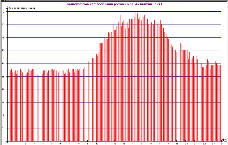 Рис. 5.2.2. Схема зондирования RTT в данном случае равно 2Т+t, где t - время задержки отклика в зондируемой ЭВМ. Зазор между пакетами t должен быть больше t. Если t больше Т, то точность измерения будет невелика. Можно подумать, что при t ё t вероятность столкновения будет равна 100%, но это не так. В этом случае столкновения не будет, ведь интерфейс обнаружит несущую у себя на входе и передачу не начнет. Передача отклика может начаться не ранее 9,6 мксек после завершения первого пакета-зонда (IPG). Если t < 9,6 мксек, передача отклика начнется через 9,6 мксек, если же больше, то через t. На практике 100% потери за счет столкновений будут реализовываться при t < t < Т+t (при t > 9,6 мксек). При t > t+t столкновения не будет, так как до измерительной машины дойдет пакет от исследуемой ЭВМ и передача не начнется из-за обнаружения интерфейсом несущей в кабельном сегменте. Следует иметь в виду, что при детектировании столкновения обе ЭВМ попытаются через некоторое время повторить попытку. Эта попытка вероятнее всего увенчается успехом, ведь они начнут ее не одновременно. Для извлечения нужных данных надо считывать содержимое регистра интерфейса, где записывается число случаев столкновений. Определив диапазон временных зазоров между пакетами-зондами, при которых происходят столкновения со 100% вероятностью, мы получим значение Т. Здесь требуются достаточно точные часы с разрешающей способностью лучше 10 мксек. Если таких часов нет, можно использовать время исполнения команд, предварительно прокалибровав это время при достаточно большом числе их исполнения. Ниже на рисунке 5.2.3 показан результат круглосуточного мониторинга в сети ГНЦ ИТЭФ. Программа позволяет не только отображать такого рода диаграммы но и измеряет относительные потери для различных сегментов сети (написана Сергеем Тимохиным). Предусмотрена возможность вывода списка машин активных в любой заданный интервал времени. По горизонтали отложено время суток 0-24 часа, а по вертикали - число ЭВМ, присылающих отклики на icmp-запросы. Нетрудно видеть, что днем активных ЭВМ больше, чем ночью. :-)
