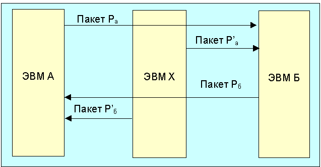 Рис. 6.2. Алгоритм атаки с использованием десинхронизации. Префикс А указывает на то, что сегмент послан атакующей ЭВМ; С - клиентом; s - сервером. Отправка атакующих кадров выделена малиновым цветом. Определенные услуги хакеру может оказать внутренний протокол маршрутизации rip. Этот протокол служит для рассылки информации о маршрутах в локальной сети и не требует контроля доступа, что всегда благоприятствует злоумышленникам. Хакер может разослать маршрутную информацию, которая убедит окружающие узлы в том, что наикратчайший путь во внешний мир проходит через ЭВМ хакера Х. Тогда все пакеты, адресованные за пределы локальной сети, будут сначала попадать в ЭВМ Х. Протокол управляющих сообщений ICMP носит вспомогательный характер (вспомним популярную утилиту ping, использующую этот протокол). Пакеты ICMP также не требуют проверки доступа (именно благодаря этому протокол пригоден для работы в масштабах Интернет). По одной этой причине протокол привлекателен для хакеров. Известны случаи, когда с его помощью люди с разных континентов бесплатно обменивались сообщениями. Пригоден протокол и для блокировки обслуживания. Для блокировки обслуживания используются icmp-сообщения "time exceeded" (превышено время) или "destination unreachable" (адресат недоступен). Первое сообщение означает, что предел указанный в поле TTL заголовка пакета превышен. Такое может произойти из-за зацикливания пакетов или, когда адресат расположен очень далеко. Сообщение "destination unreachable" имеет несколько значений. Но все они означают, что нет способа благополучно доставить пакет адресату. Оба сообщения вынуждают адресата немедленно прервать соединение. Для реализации своих коварных планов хакеру достаточно послать одно из этих сообщений одному или обоим участникам обмена. Протокол ICMP может использоваться и для перехвата пакетов. ICMP-сообщение "redirect" обычно используется внешними портами (gateway) сети в случаях, когда какая-то ЭВМ по ошибке полагает, что адресат находится вне локальной сети и направляет пакеты, адресованные ему, через внешний порт. Хакер может послать ICMP-сообщение "redirect" и вынудить другую ЭВМ посылать пакеты через узел, указанный хакером. У данного метода (также как и предыдущего с использованием RIP) имеется определенное ограничение - хакер и жертва должны находиться в пределах общей локальной сети. Ещё одним объектом атак может стать DNS (domain name service) локальной сети. Например, администратор узла durak.dura.com может принять решение разрешить только местные соединения. Это может быть специфицировано с помощью записи "allow *.dura.com", а не обязательно через указание IP-адресов. Тем более, что в сети может использоваться большое число блоков IP-адресов. Когда соединение установлено ЭВМ durak обращается к DNS для того, чтобы преобразовать IP-адрес отправителя в имя, которое затем служит для проверки условия, заданного администратором. Если хакер имеет доступ к местному DNS-серверу, он может заставить DNSоткликаться на его IP-адрес любым именем ЭВМ или домена. Зная об установленных администратором ограничениях, хакер может сделать так, что на запрос с его IP-адресом DNS будет откликаться именем "trustme.dura.com" (что удовлетворяет установленному ограничению). Такая атака может быть легко предотвращена путем повторного DNS-запроса с именем ЭВМ, присланным при первом запросе. Если IP-адрес, полученный при втором зап