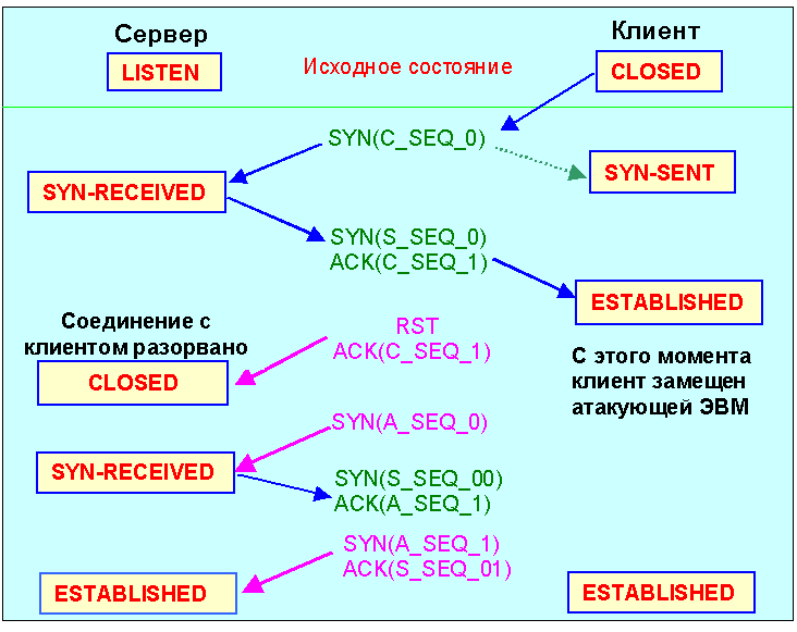 Рис. 6.1 Десинхронизация может быть осуществлена при установлении соединения. Хакер в этом случае обрывает процесс трехшагового диалога. После того как ЭВМ Б пошлет SYN+ACK ЭВМ А, ЭВМ хакера пошлет пакет от Б к А, который с помощью бита RST оповещает о закрытии соединения. После этого затевается новый трехшаговый диалог с целью установления соединения с А, но уже с другими кодами порядковых номеров. Схема алгоритма атаки показана на рис. 6.2 (Сравните с рис. 4.4.3.3 и 4.4.3.4). ЭВМ Б проигнорирует сообщения от А, так как они имеют неправильные (навязанные хакером) номера, а ЭВМ А проигнорирует сообщения от Б, так как ожидает, что они будут пронумерованы по-новому. Теперь хакер знает, какие номера нужны А и Б (непосредственно же А и Б взаимодействовать не могут, так как не знают правильных номеров) и может перехватывать, модифицировать или посылать сообщения по своему усмотрению как А, так и Б. Но десинхронизация может быть реализована и в ходе сессии. Если послать флаг RST в середине сессии, соединение будет закрыто, о чем будет оповещено приложение и пользователь. Для того чтобы вызвать десинхронизацию в середине сессии, не закрывая соединения, достаточно поменять порядковые номера в сообщениях. Протокол telnet имеет механизм, который позволяет решить такую задачу. В рамках протокола можно посылать команды nop ("Ничего не делать", согласитесь - хорошие команды!). Эти команды не производят никакого эффекта, но увеличивают ожидаемое значение порядкового номера сегмента. Послав некоторое количество таких команд, ЭВМ хакера вызовет десинхронизацию. Теперь только хакер знает правильные значения порядковых номеров пакетов и может начать свою подрывную работу. Одним из наиболее эффективных методов обнаружения таких атак помимо процента сегментов ACK является сравнение потоков ACK для сервера и клиента. Полной гарантией безопасности в такой ситуации может стать только шифрование на прикладном уровне, например по схеме kerberos. В случае использования почты хороший результат может дать электронная подпись (например, PGP). Атака на раннем этапе установления соединения может осуществляться следующим образом. Соединение при этом разрушается и вместо него формируется новое с другим значением ISN. Хакер прослушивает виртуальный канал и ждет сообщения SYN+ACK от сервера клиенту (вторая фаза установления соединения). При получении такого сообщения хакер посылает серверу RST-кадр, а затем SYN-пакет с теми же параметрами (TCP-порт), но с другим значением ISN (далее и на рис 6.2 этот кадр обозначается a_ack_0; префикс А указывает на принадлежность атакующей машине хакера). Сервер, получив RST, закроет прежнее соединение и, получив SYN, сформирует новое для того же порта, но с новым значением ISN. После чего пошлет клиенту кадр SYN+ACK. Детектировав это пакет хакер посылает серверу кадр ACK. При этом сервер переходит в состояние established. Клиент перешел в это состояние при получении от сервера первого кадра SYN+ACK. На рис. 6.2 не показан обмен пакетами ACK, вызванными получением некорректных значений ISN. Как сервер так и клиент находятся в несинхронизованном состоянии established. Обмен здесь полностью контролируется атакующей ЭВМ