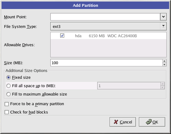 Размер (MB) (Size (Megs)): Введите размер раздела в мегабайтах. Обратите внимание, что по умолчанию в этом поле стоит "1", и, если вы не внесете изменений, у вас будет раздел размером 1 MB.