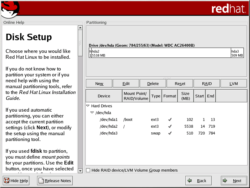 LVM: Позволяет вам создать LVM логическое и физическое устройства. Роль LVM (Logical Volume Manager) такова — он дает простое логическое представление соответствующего физического хранящего пространства, например, жесткого диска (дисков). LVM управляет отдельными физическими дисками — или, чтобы быть более точными, индивидуальными разделами, существующими на них. Используйте его только в том случае, если у вас уже имеется опыт работы с LVM. Чтобы узнать больше об этом интересном явлении, обратитесь к Official Red Hat Linux Customization Guide.