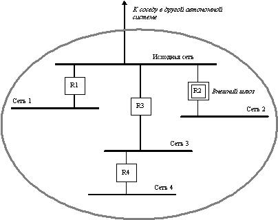 Поэтому детальная топологическая информация остается внутри автономной системы, а автономную систему как единое целое для остальной части Internet представляют внешние шлюзы, которые сообщают о внутреннем составе автономной системы минимально необходимые сведения - количество IP-сетей, их адреса и внутреннее расстояние до этих сетей от данного внешнего шлюза.